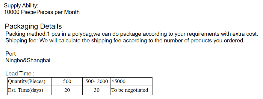 For samples, the lead time is about 7 days. Our sample fee is USD40/pc, sample fee can refund when order is reach 1000pcs/style. Sample time is 7~10workdays within 5styles. For bulk production, the ETD time is 20-30 days after receiving the down payment. The ETD become effective when (1) we have received your deposit, and (2) we have your final approval for PPsample. If our lead times do not work with your deadline, please go over your requirements with your sale. In all cases we will try to accommodate your needs. In most cases we are able to do so.